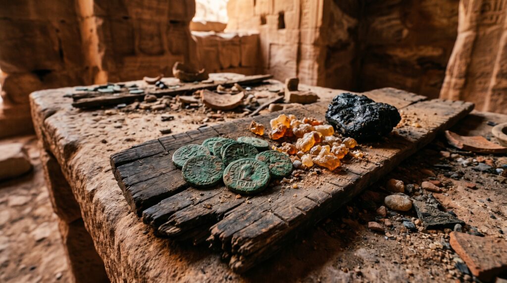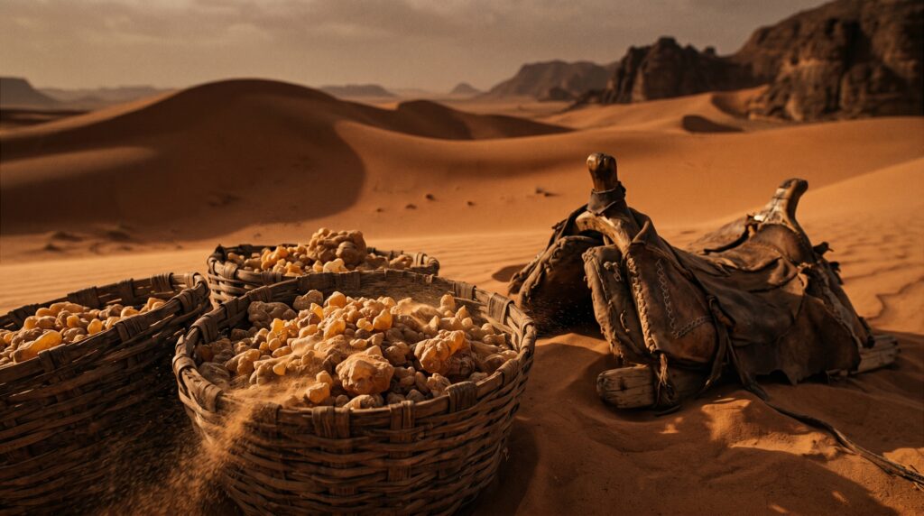 لم تكنِ القوةُ الحقيقيةُ للأنباطِ تكمنُ في سيوفِهم أو رماحِهم، بل كانتْ تتجسّدُ في قوافلِهم التي كانتْ تقطعُ آلافَ الأميالِ محمّلةً بأغلى سلعةٍ عرفتْها البشريةُ في ذلكَ الزمان: “البخورُ والمرّ”. في العالمِ القديم، لم يكنِ البخورُ مجرّدَ عطرٍ للزينة، بل كانَ ضرورةً دينيةً قصوى تُحرقُ في معابدِ روما واليونان ومصرَ لإرضاءِ الآلهة، وضرورةً طبيةً لعلاجِ الأمراض، وجزءاً أساسياً من طقوسِ الدفنِ وتحنيطِ الملوكِ والأباطرة. كانتْ أشجارُ اللبانِ والمرِّ تنمو حصرياً في المناطقِ الجنوبيةِ من شبهِ الجزيرةِ العربيةِ (ظفار في عُمان، وحضرموت في اليمن)، وكانَ نقلُها إلى أسواقِ البحرِ المتوسطِ يتطلبُ عبورَ صحارٍ شاسعةٍ ومحفوفةٍ بالمخاطر. هنا برزَ دورُ الأنباطِ كوسطاءَ حصريين ومُحتكرينَ لهذه التجارةِ المربحة، حيثُ أقاموا سلسلةً من المحطاتِ التجاريةِ والحامياتِ العسكريةِ الممتدةِ من “مدائن صالح” (الحجر) في شبهِ الجزيرةِ العربية، وصولاً إلى ميناءِ “غزة” على البحرِ المتوسط.