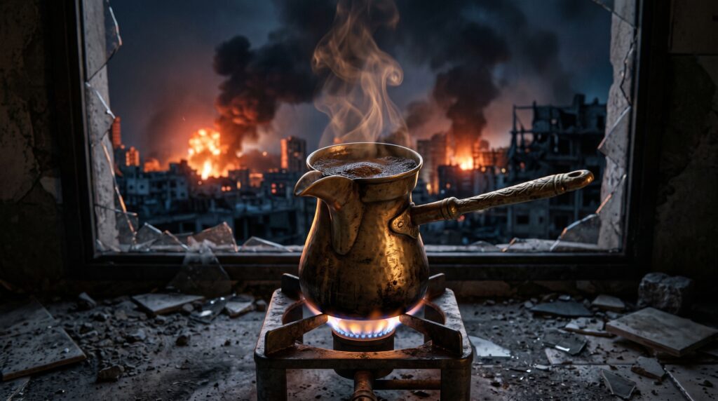 | صناعةُ القهوة في بيروت | تحول طقوس إعداد القهوة تحت القصف إلى فعلِ مقاومةٍ عبثيّ وتشبثٍ بالحياة في وجه الفناء المفتوح. |