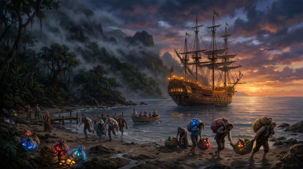 لعل أروع ما في رسالة الكنديّ، والذي جعلها تتجاوز حدود زمانها لتخاطب الإنسان المعاصر المنهك بالنزعة الاستهلاكية المادية، هو “استعارة السفينة” الملحمية التي صاغها لوصف حالة البشر في رحلة الحياة. يشبّه الكنديّ البشر بركاب سفينةٍ توقفت بهم في جزيرةٍ لقضاء حاجةٍ سريعة، وهؤلاء الركاب انقسموا إلى فرقٍ متباينة في تعاملهم مع هذه المحطة المؤقتة. الفرقة الأولى العاقلة، قضت حاجتها بسرعة وعادت إلى السفينة لتتخذ أفضل الأماكن وأكثرها راحةً، مُدركةً أن الجزيرة مجرد محطة عبور. أما الفرق الأخرى، فقد اغترت بجمال الجزيرة، وأخذت تجمع ثمارها السريعة التلف، وأحجارها الثقيلة الملونة، حتى إذا نادى قبطان السفينة بالرحيل، عادوا مُثقلين بأحمالٍ تعيق حركتهم، فوجدوا السفينة قد امتلأت، واضطروا للجلوس في قاعها المظلم الخانق، محاطين بأحجارٍ لا تنفعهم، وثمارٍ تعفنت وأصبحت مصدر مرضٍ وروائح كريهة.